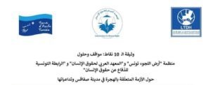 Les trois organisations ayant présenté ce document ont appelé les autorités tunisiennes à s’engager dans le dialogue et d’adopter des consultations multilatérales avec les diverses organisations onusiennes, internationales et nationales , actives en Tunisie conformément à la loi tunisienne, pour pouvoir tirer parti des compétences des différentes organisations internationales gouvernementales et non-gouvernementales.