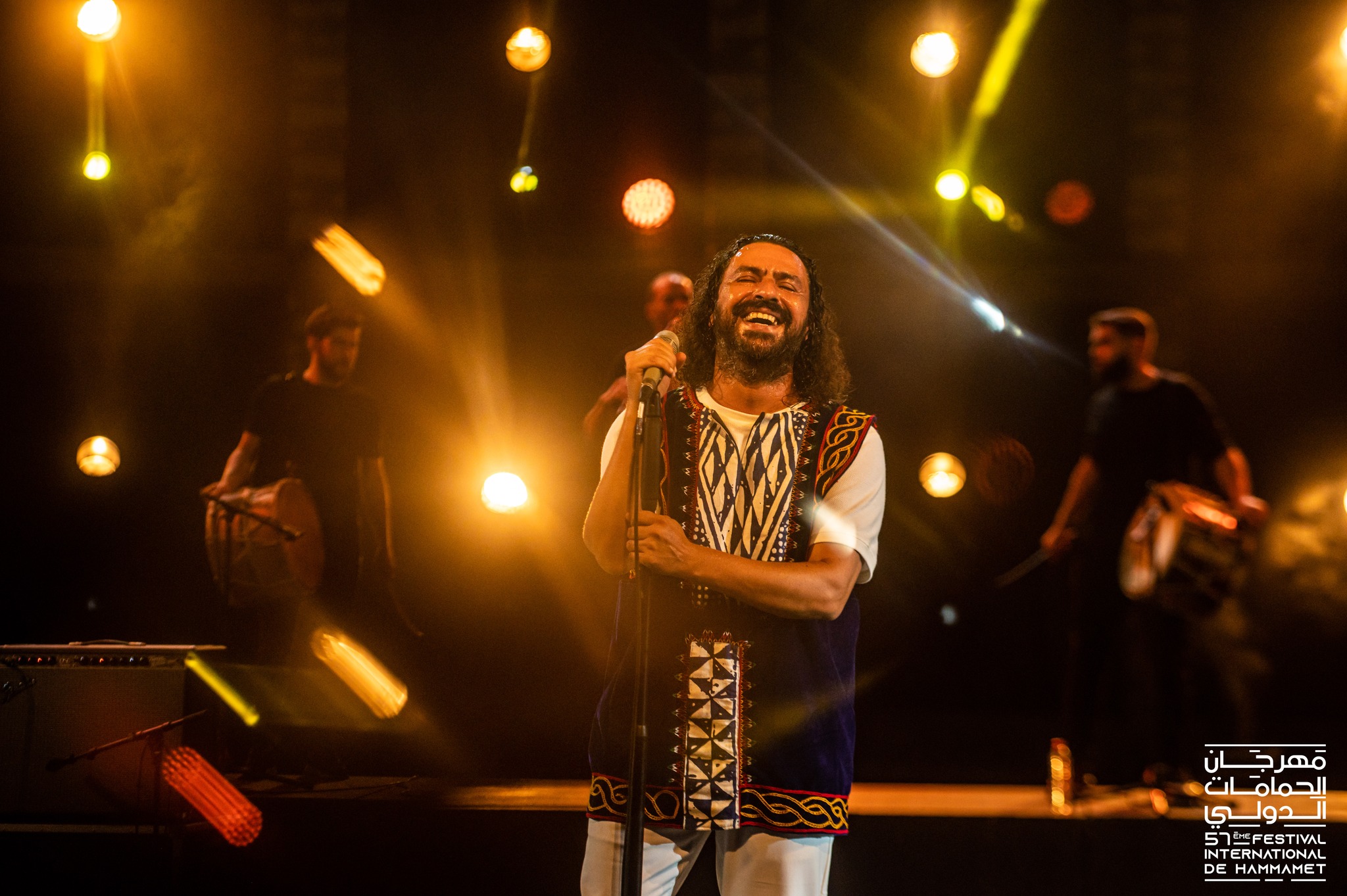 La suite de la soirée a eu lieu avec Nidhal Yahyaoui et son projet « Chemin des Hattaya » (Masreb El Hattaya). Accompagné de Mustapha Ben Mansour à la machine (son électronique) et clavier, Moez Ben Rhouma, Badr Eddine Bouslimi et Skander Ben Ammou à la percussion, Mohamed Chebbi à la gasba et Mahdi Bahri à la guitare électrique, Nidhal a enflammé la scène, laissant le public entier en sueur. Sur une durée d’une heure, Nidhal Yahyaoui et ses compagnons ont présenté un répertoire d’une dizaine de morceaux dont le mythique « Hez Ayounek », « Nasek Rahala » et « Lasmer » avec une particularité sonore incroyable, mélangeant les chansons du terroir avec différentes formes musicales traditionnelles, authentiques et modernes. La 57ème édition du Festival International de Hammamet se poursuit jusqu’au 12 août 2023, et le dimanche 30 juillet l’amphithéâtre du FIH accueillera le chanteur tunisien Saber Rebai