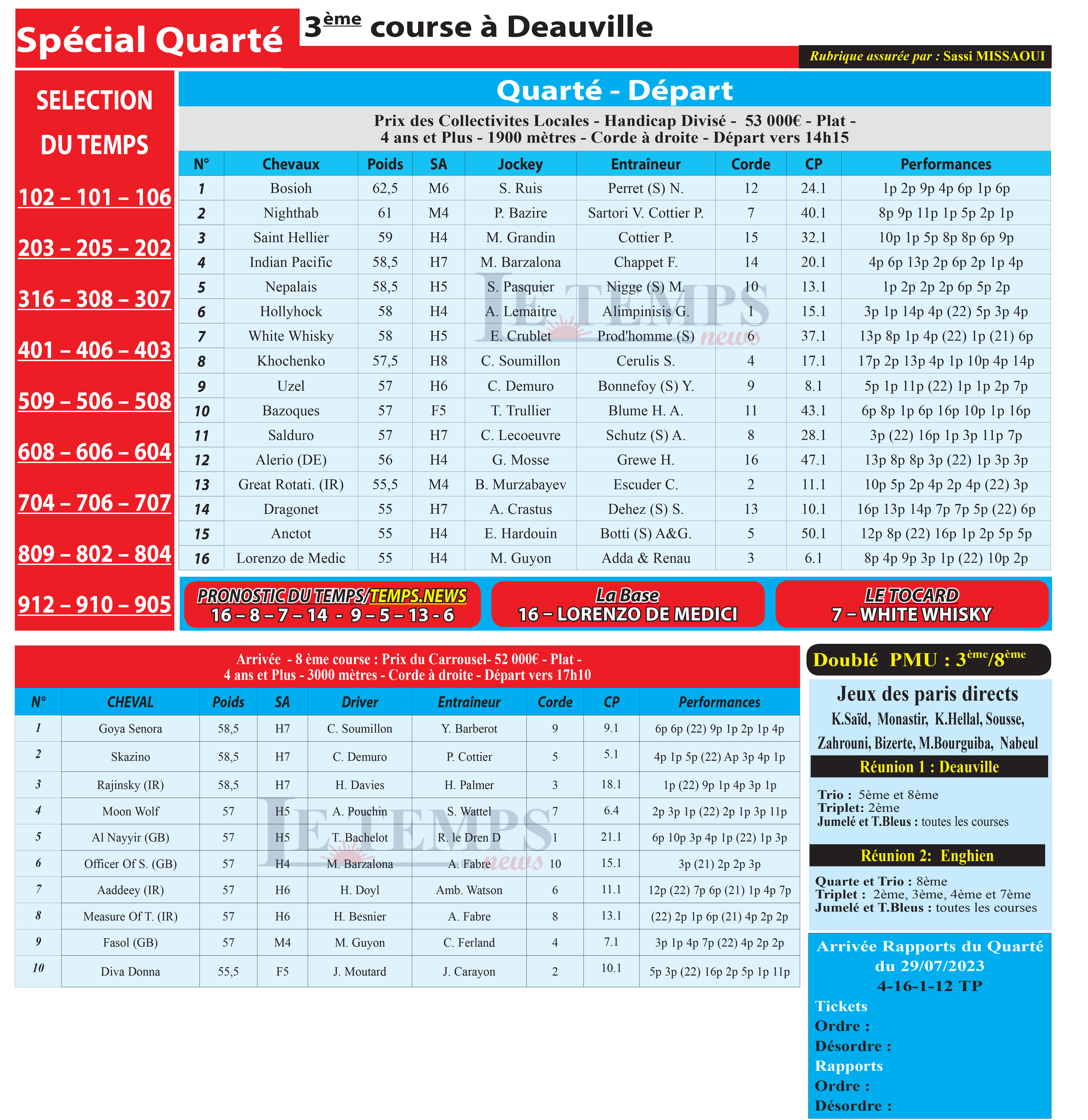 Notre spécial Quarté d’aujourd’hui, 3ème course à Deauville, donne notre pronostic du Temps/ Temps News avec le cheval n°16 Lorenzo De Medici étant la base, tandis que le Tocard est le cheval n°7 White Whisky.
