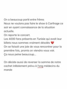Les rappeurs français Bigflo et Oli ont annoncé récemment leur décision de « reporter » le concert, qui devait avoir lieu ce mercredi soir à Carthage, en partageant sur leurs comptes Facebook et Instagram le texte suivant : « On a beaucoup parlé entre frères .. Nous ne voulons pas faire le Show à Carthage ce soir en ayant connaissance de la situation actuelle .. On reporte le concert. Les 4000 fans présents en Tunisie qui avaient leurs billets nous sommes vraiment désolés. On se faisait une joie de vous rencontrer pour la première fois, promis on viendra vous voir. Ça nous peine beaucoup … On décide aussi de réserver notre cachet initialement prévu pour l’ONG Médecins du Monde ».