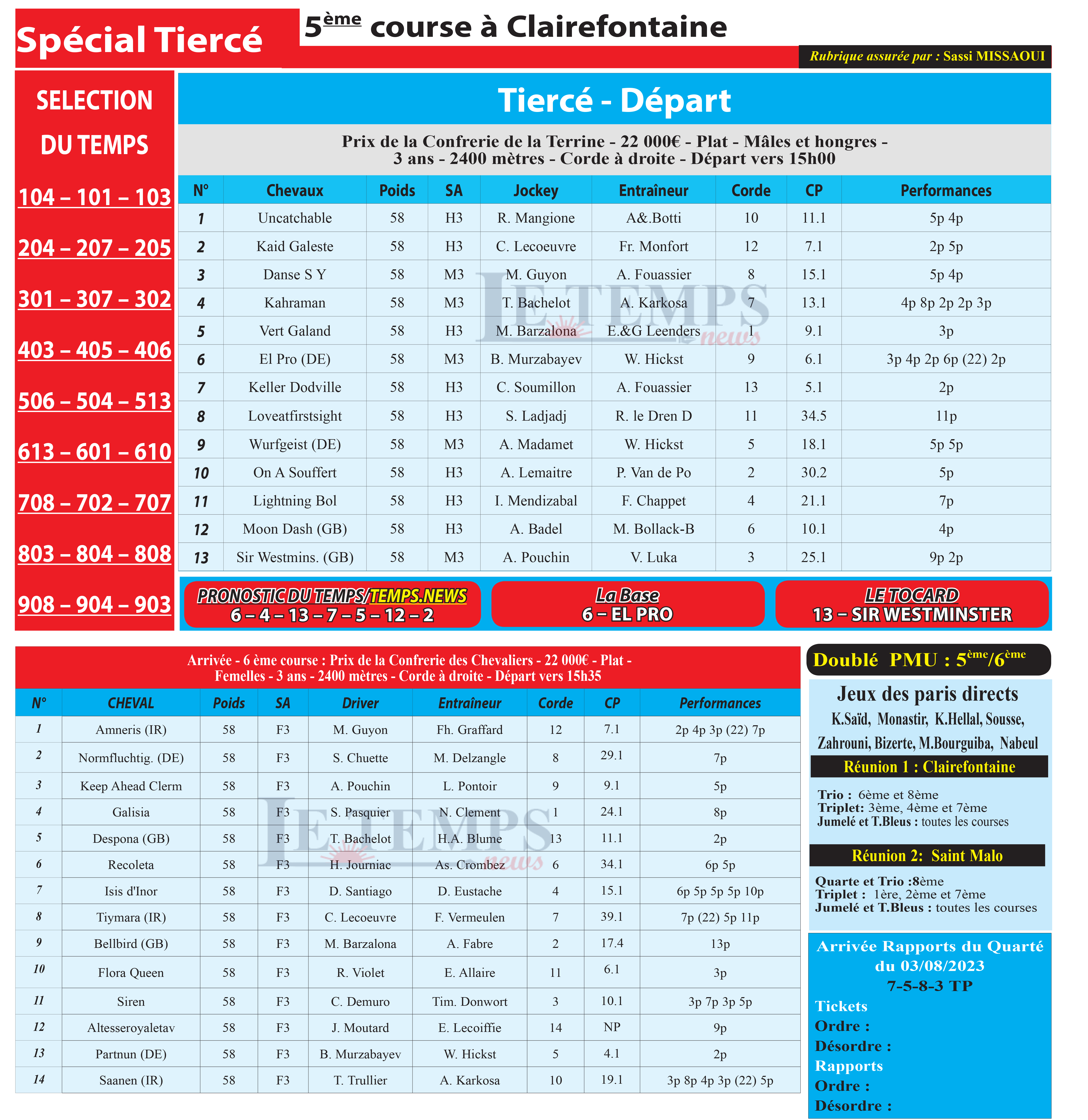 Notre spécial Tiercé d’aujourd’hui, 5ème course à Clairefontaine, donne notre pronostic du Temps/ Temps News avec le cheval n°6 El Pro étant la base, tandis que le Tocard est le cheval n°13 Sir Westminster.