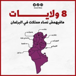 Aswat Nissa a fait rappeler, en outre, la diminution enregistrée au niveau de la représentativité des femmes au sein de l’actuel parlement, tout en soulignant que la non-représentativité parlementaire des femmes a touché les 8 gouvernorats suivants : Béja, Jendouba, Sidi Bouzid, Gafsa, Tozeur, Zaghouan, Mahdia et Kairouan.
