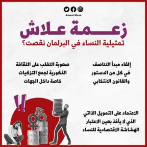 D’après l’association, plusieurs facteurs ont contribué à ce recul, notamment l’adoption de l’autofinancement qui ne prend pas en considération la vulnérabilité économique subie par les femmes et l’annulation du principe de la parité dans la constitution et dans la loi électorale.