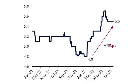 Il n’a pas fallu longtemps à la Chine pour prendre ces virages, amorçant ce que l’on appelle la « réouverture économique ». En conséquence, depuis le début de l’année, les prévisions consensuelles de croissance pour la Chine ont augmenté de 70 points de base pour atteindre 5,5 %. Malgré la faiblesse persistante de l’industrie manufacturière, la consommation de services a explosé, dépassant même sa tendance prépandémique. Sept mois plus tard, nous maintenons notre prévision de croissance de 5,5 % pour la Chine en 2023.