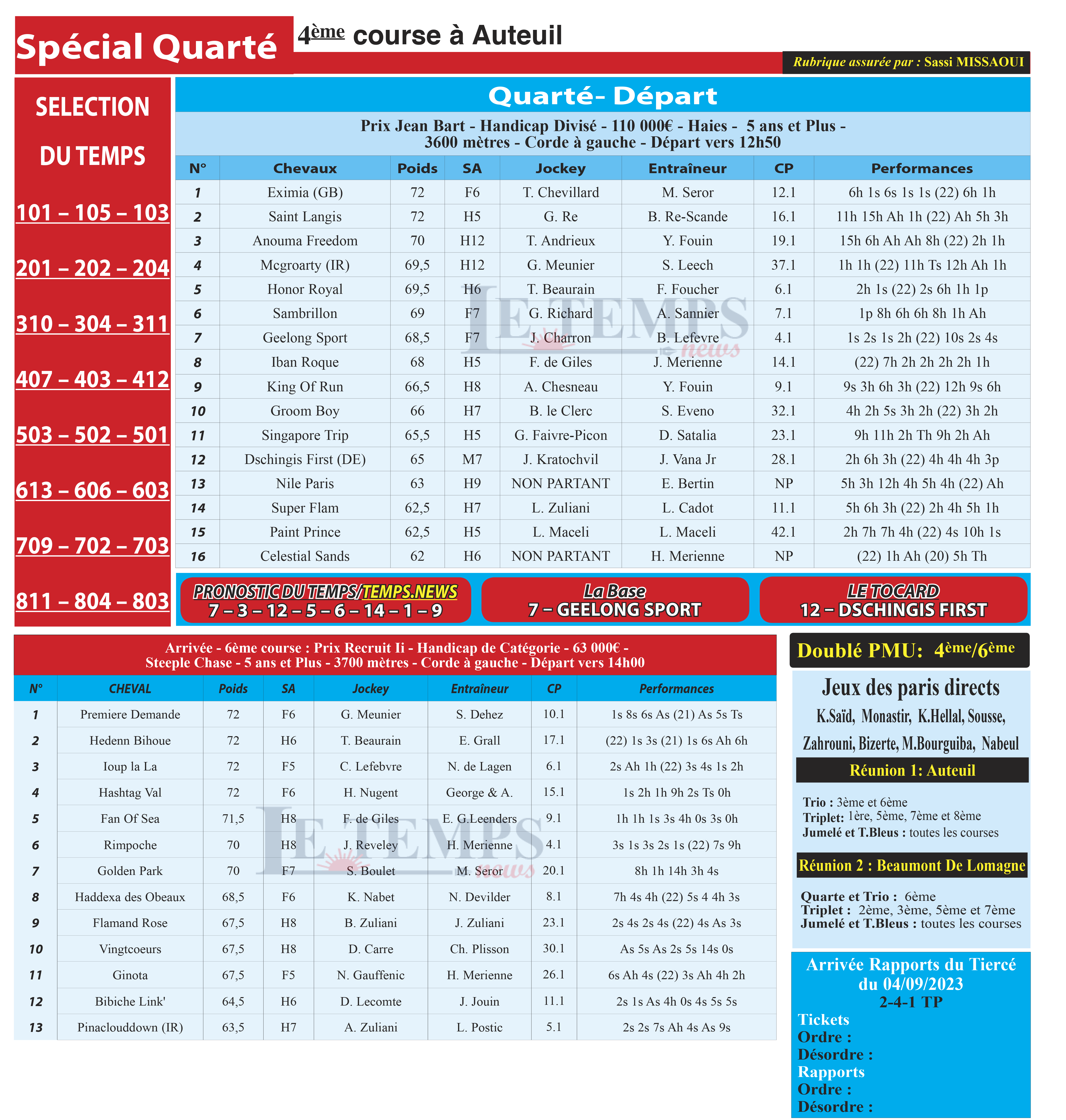Partager Facebook Twitter LinkedIn Pinterest Email Notre spécial Quarté d’aujourd’hui, 4ème course à Auteuil, donne notre pronostic du Temps/ Temps News avec le cheval n°7 Geelong Sport étant la base, tandis que le Tocard est le cheval n°12 Dschingis First. PMU Turf