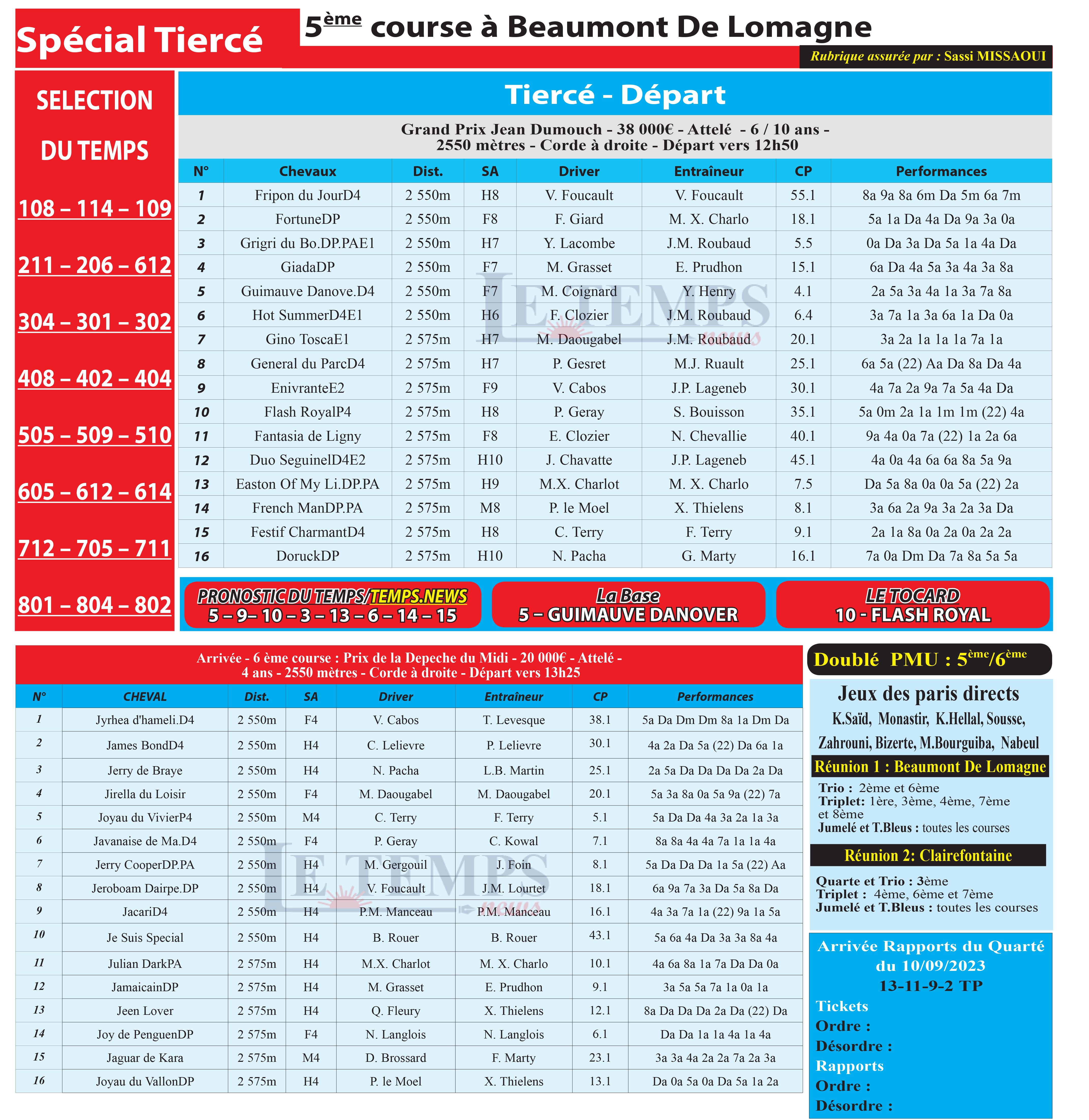 Notre spécial Tiercé d’aujourd’hui, 5ème course à Beaumont De Lomagne, donne notre pronostic du Temps/ Temps News avec le cheval n°5 Gauimauve Danover étant la base, tandis que le Tocard est le cheval n°10 Flash Royal.