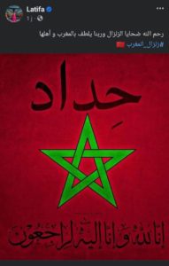 Pour sa part, la chanteuse Latifa Arfaoui a partagé sur sa page Facebook officielle une photo du drapeau marocain accompagnée d’un texte comprenant un hommage à la mémoire des victimes de ce drame.