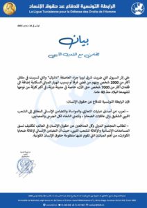 À la suite des inondations ayant récemment dévasté la Libye, la Ligue tunisienne pour la défense des droits de l’Homme (LTDH) a exprimé sa solidarité avec le peuple libyen tout en présentant ses sincères condoléances aux familles des victimes , et ce à travers un communiqué rendu public ce mardi 12 septembre, sur sa page Facebook officielle.