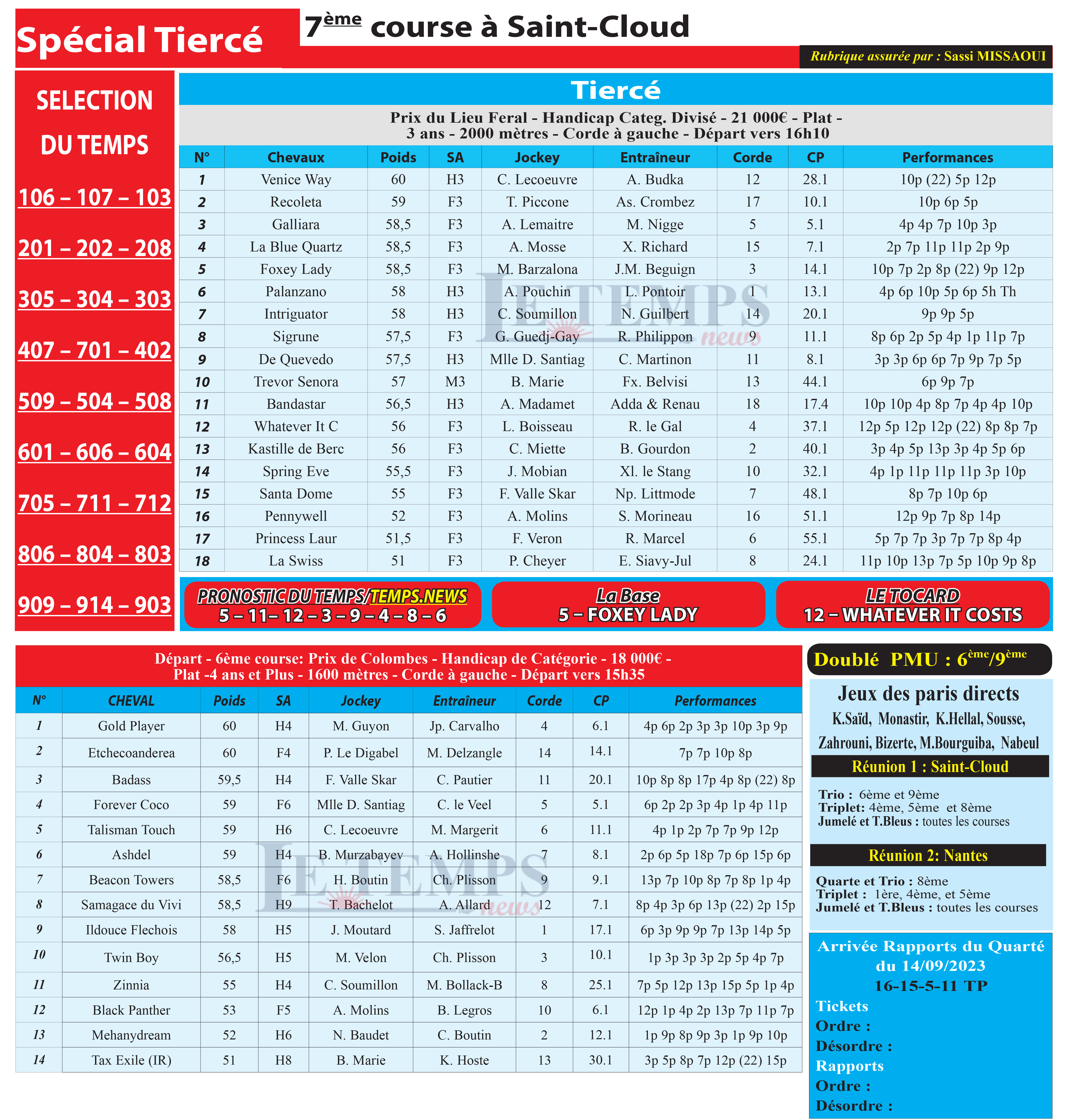 Partager Facebook Twitter LinkedIn Pinterest Email Notre spécial Tiercé d’aujourd’hui, 7ème course à Saint-Cloud, donne notre pronostic du Temps/ Temps News avec le cheval n°5 Foxey Lady étant la base, tandis que le Tocard est le cheval n°12 Whatever Costs. PMU Turf
