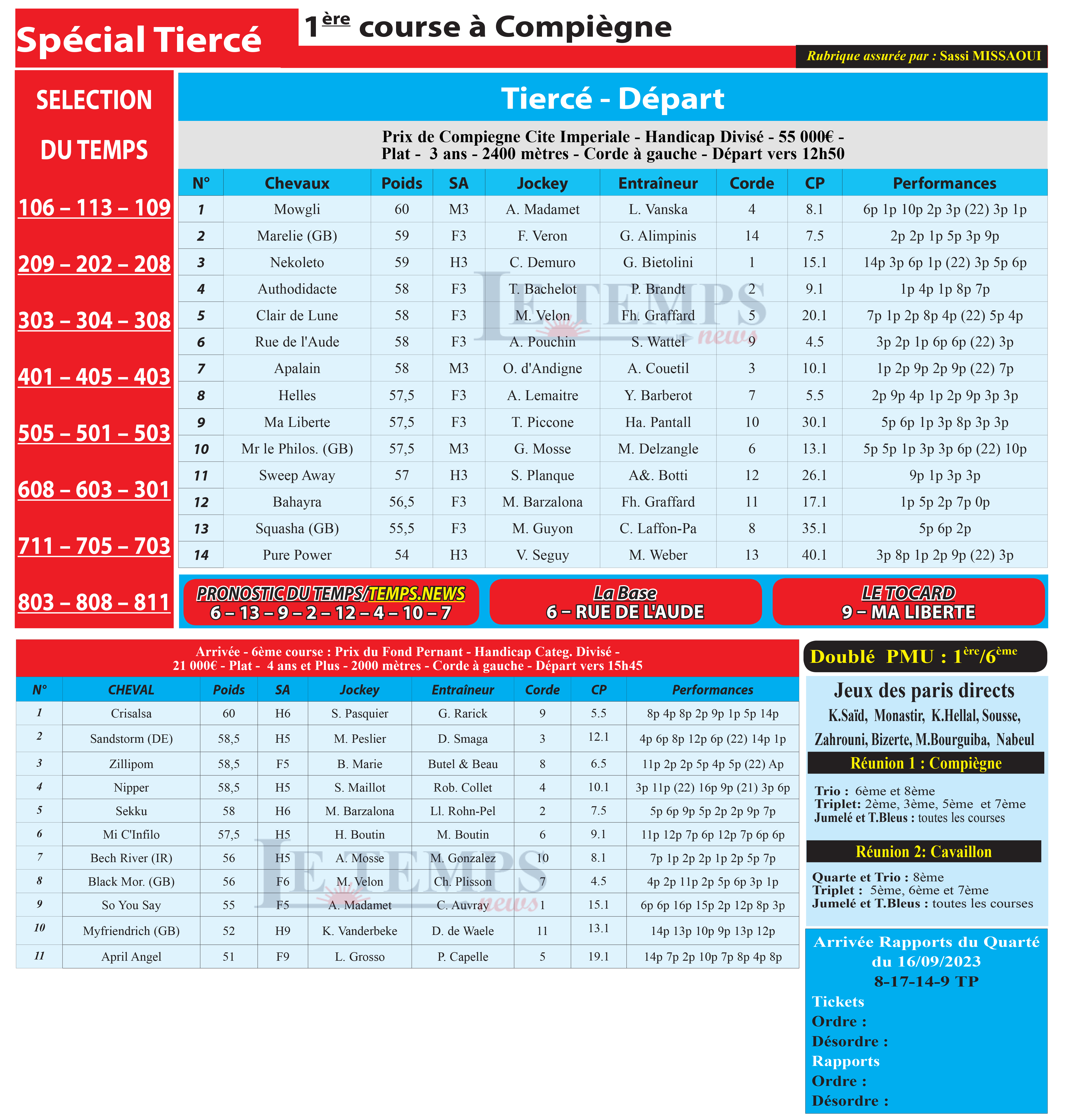 Notre spécial Tiercé d’aujourd’hui, 1ère course à Compiègne, donne notre pronostic du Temps/ Temps News avec le cheval n°6 Rue De L’Aude étant la base, tandis que le Tocard est le cheval n°9 Ma Liberte.