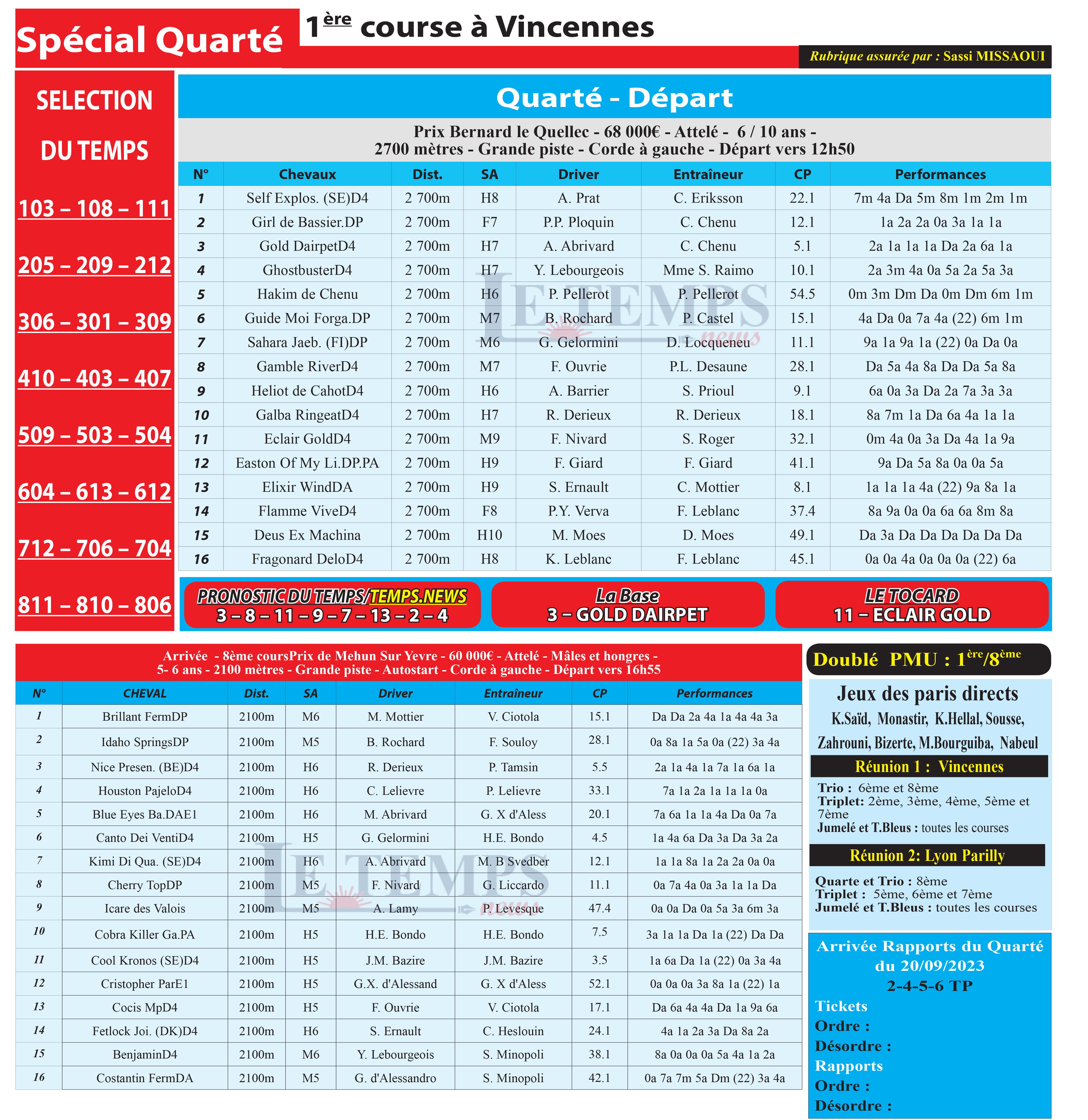 Notre spécial Quarté d’aujourd’hui, 1ère course à Vincennes, donne notre pronostic du Temps/ Temps News avec le cheval n°3 Gold Dairpet étant la base, tandis que le Tocard est le cheval n°11 Eclair Gold.