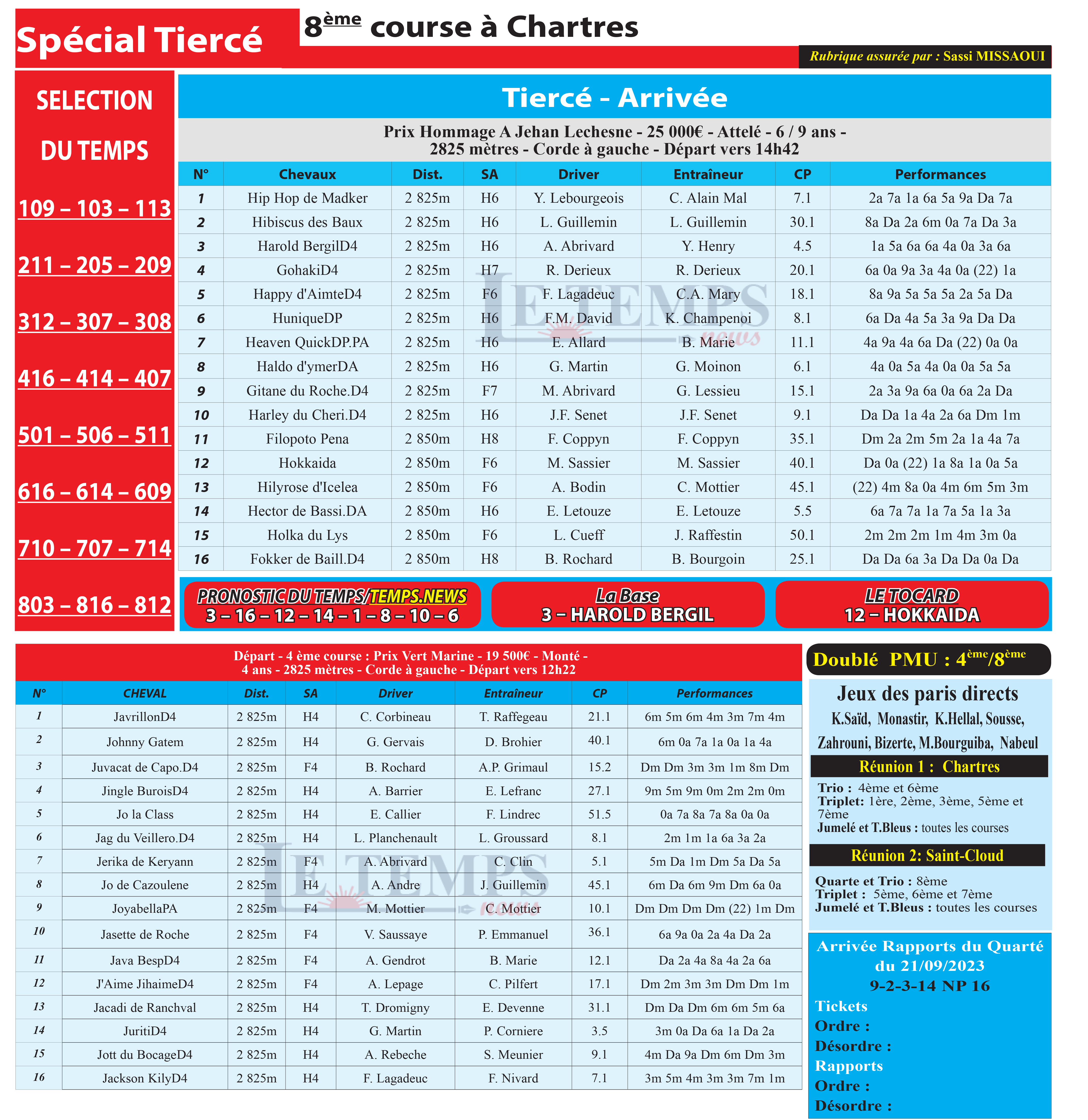 Notre spécial Tiercé d’aujourd’hui, 8ème course à Chartres, donne notre pronostic du Temps/ Temps News avec le cheval n°3 Harold Bergil étant la base, tandis que le Tocard est le cheval n°12 Hokkaida.