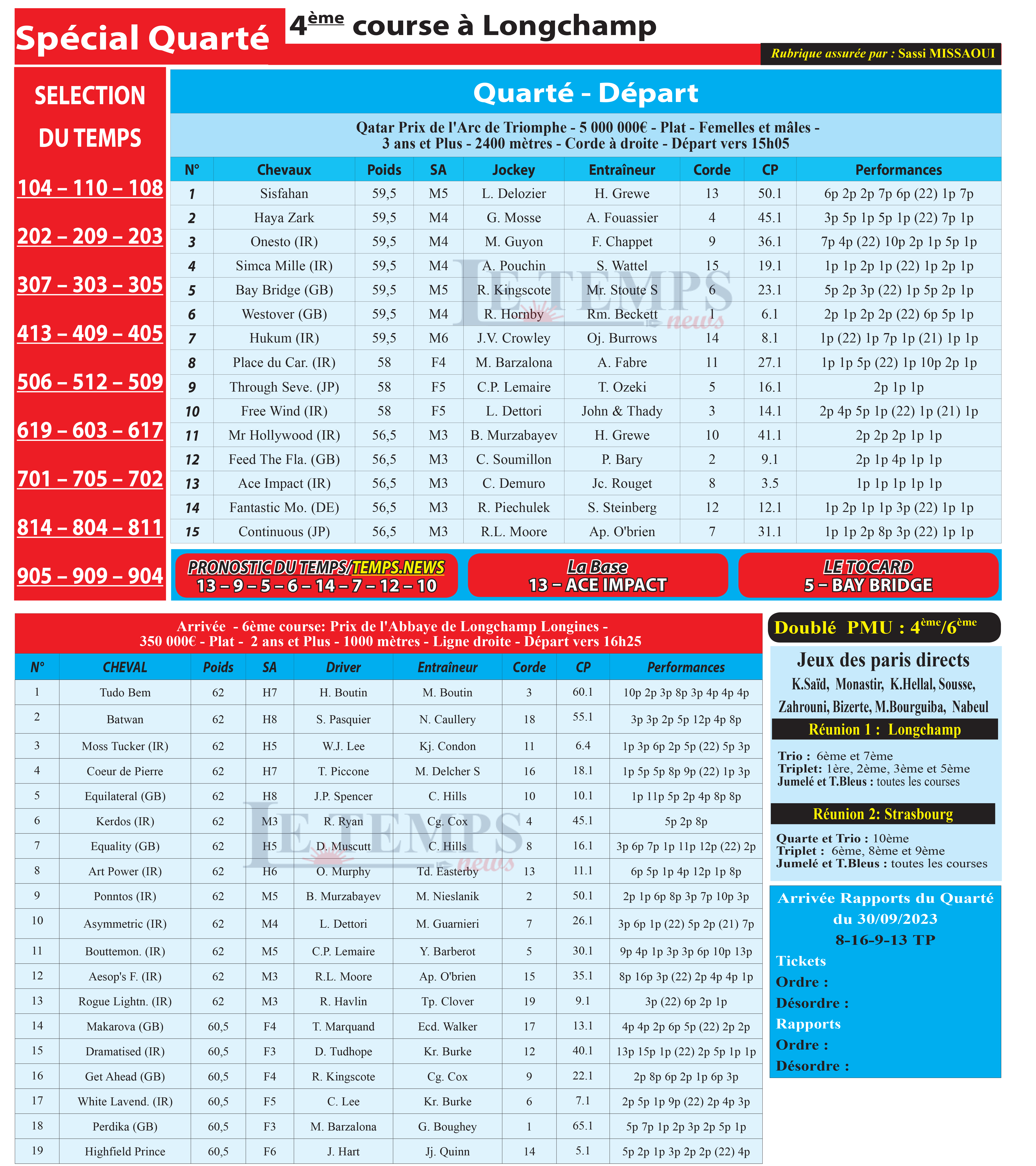 Partager Facebook Twitter LinkedIn Pinterest Email Notre spécial Quarté d’aujourd’hui, 4ème course à Longchamp, donne notre pronostic du Temps/ Temps News avec le cheval n°13 Ace Impact étant la base, tandis que le Tocard est le cheval n°5 Bay Bridge. PMU Turf