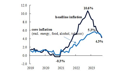 Tout d’abord, l’inflation a déjà considérablement diminué par rapport à son pic à deux chiffres et continue de consolider sa tendance à la baisse. Les dernières données publiées montrent que l’inflation globale a diminué de plus de moitié, passant de 10,6 % en octobre 2022 à 4,3 % le mois dernier. L’inflation de base, qui exclut les prix plus volatiles des biens tels que les denrées alimentaires et l’énergie, et qui est généralement plus persistante, a commencé à diminuer en avril de cette année et a chuté de 0,6 point de pourcentage (p.p.) en septembre. En outre, les mesures des attentes à long terme ont été contenues et se situent maintenant autour de l’objectif de 2 %. La maîtrise des anticipations est essentielle pour éviter de nouvelles pressions sur les prix de la part des entreprises et des revendications salariales plus élevées de la part des travailleurs. Dans l’ensemble, la baisse des taux d’inflation et la maîtrise des anticipations plaident en faveur d’une pause du taux directeur.
