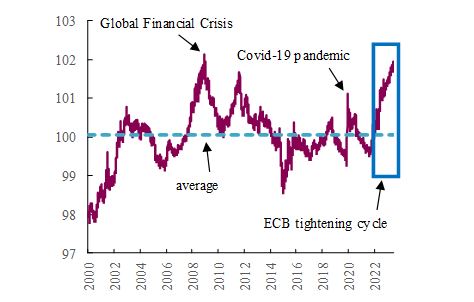 Ensuite, le cycle record de hausses des taux directeurs, combiné à la normalisation du bilan de la BCE, a resserré les conditions financières à des niveaux exceptionnels. L’indice des conditions financières pour la zone euro fournit un résumé utile des coûts du crédit. Cet indicateur combine des informations sur les taux d’intérêt à court et à long terme, ainsi que sur les écarts de crédit. L’indice a entamé une tendance régulière à la hausse en juillet 2022 et se situe actuellement à un niveau qui n’a été enregistré qu’au pire de la crise financière mondiale, lorsque l’économie européenne a été confrontée à un resserrement du crédit et que les prix des actifs se sont effondrés.