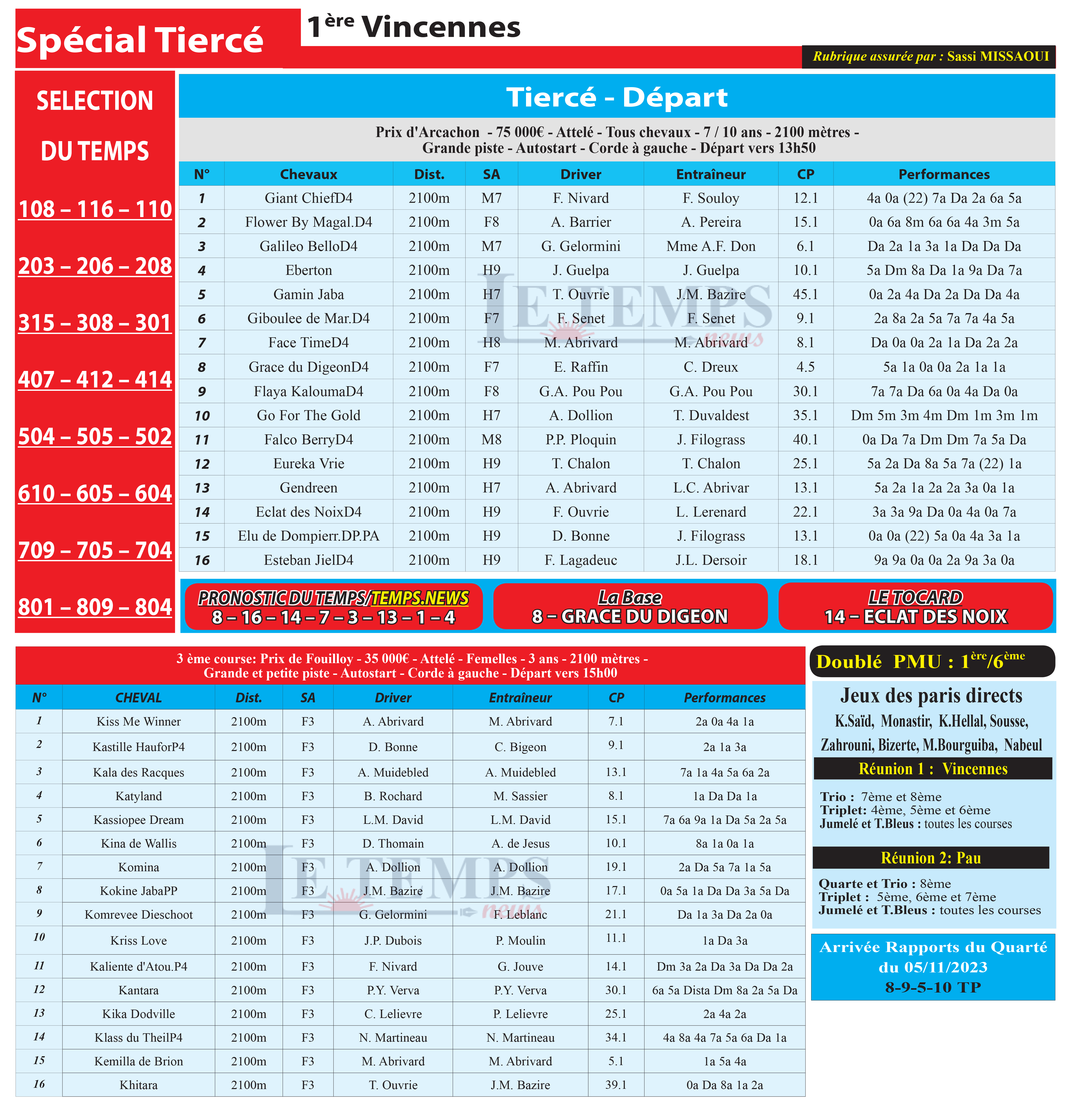 Notre spécial Tiercé d’aujourd’hui, 1ère course à Vincennes, donne notre pronostic du Temps/ Temps News avec le cheval n°8 Grace Du Digeon étant la base, tandis que le Tocard est le cheval n°14 Eclat Des Noix.