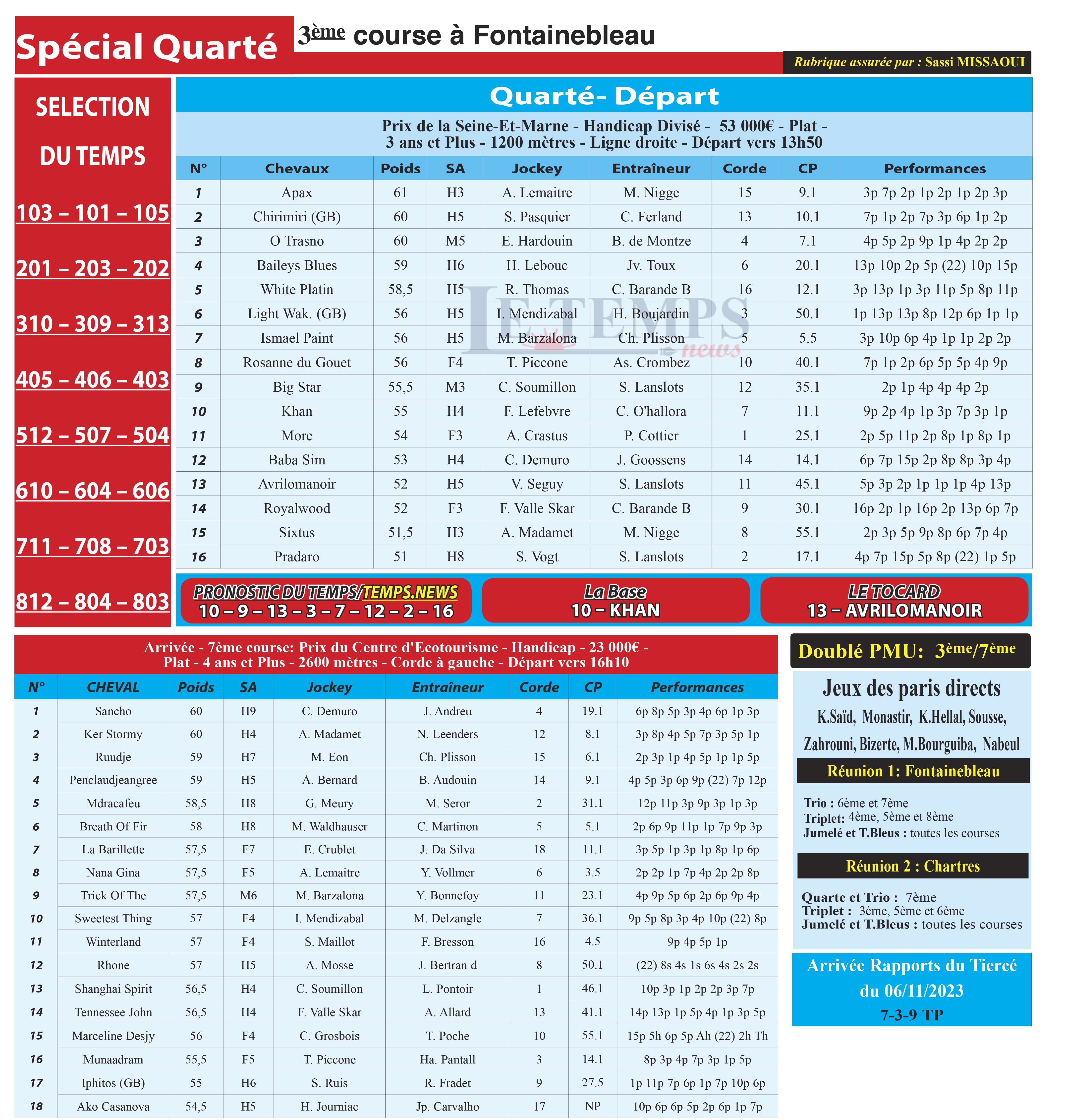 Partager Facebook Twitter LinkedIn Pinterest Email Notre spécial Quarté d’aujourd’hui, 3ème course à Fontainebleau, donne notre pronostic du Temps/ Temps News avec le cheval n°10 Khan étant la base, tandis que le Tocard est le cheval n°13 Avirlomanoir. PMU Turf
