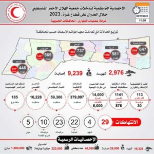 Le Croissant Rouge Palestinien a indiqué dans une publication partagée ce mercredi 08 octobre sur sa page Facebook officielle que le nombre des agressions sionistes ayant ciblé ses équipes à Gaza à atteint 29 agressions jusqu’à la date de la publication de ces statistiques. Dans le même contexte, le Croissant Rouge Palestinien a mentionné que ces agressions sionistes sont réparties comme suit : décès de 04 martyrs, blessure de 22 membres, ciblage de 23 véhicules et 05 bâtiments du Croissant Rouge Palestinien a Gaza. En revanche, il a été noté que 10 véhicules sont devenus hors service à cause de ces agressions.