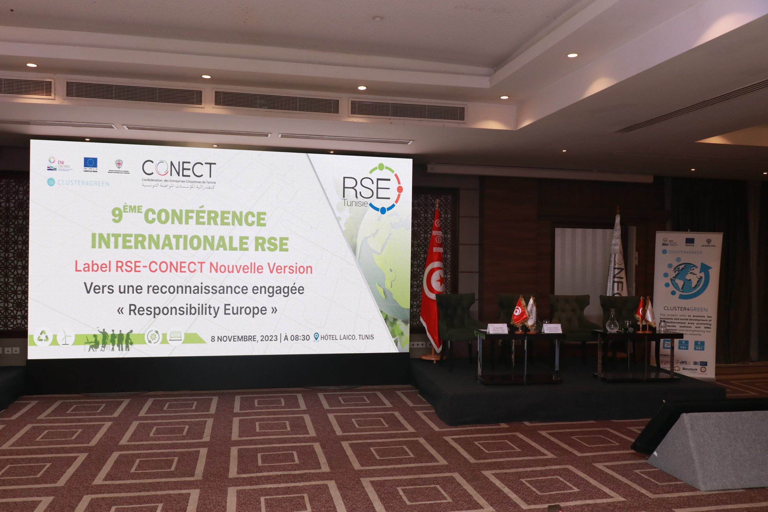 La Confédération des Entreprises Citoyennes de Tunisie -CONECT-a dévoilé l’évolution de son Label RSE vers une nouvelle version, dans le cadre du projet Cluster4Green mis en œuvre par le programme ENI CBC MED et le financement de l’UE, et ce, lors de la 9éme édition de la Conférence Internationale sur la RSE, organisée le 08 Novembre 2023 à l’Hôtel Laico Tunis, sur le thème « Label RSE-CONECT Nouvelle Version : Vers une reconnaissance engagée Responsibility Europe ».