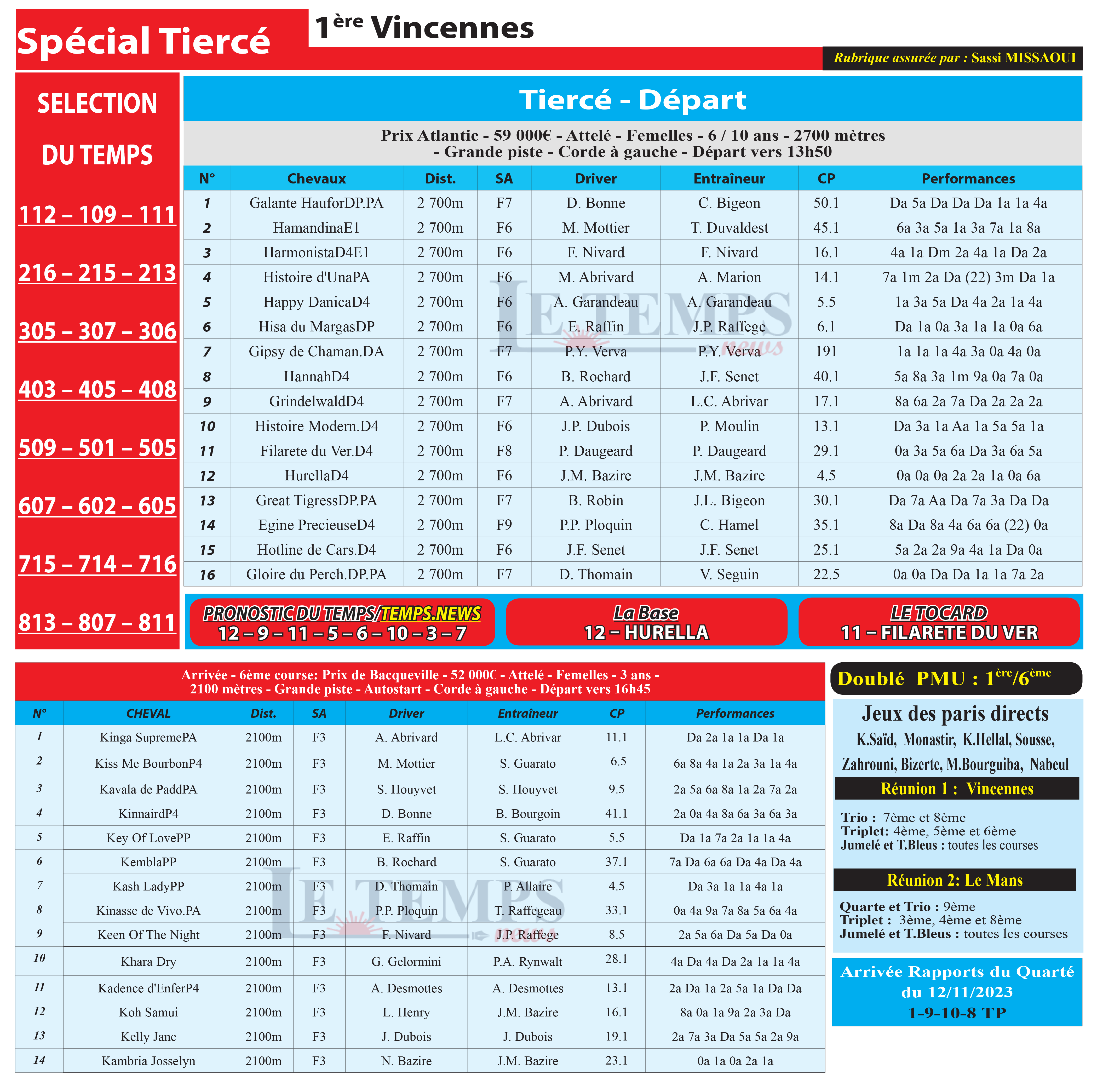 Notre spécial Tiercé d’aujourd’hui, 1ère course à Vincennes, donne notre pronostic du Temps/ Temps News avec le cheval n°12 Hurella étant la base, tandis que le Tocard est le cheval n°11 Filarete Du Ver.