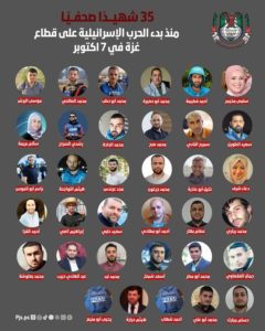 Le Syndicat des journalistes palestiniens a indiqué hier soir (lundi 13 octobre) que le nombre des martyrs décédés à la suite de l’agression sioniste à Gaza parmi les journalistes a atteint 35 depuis le 07 octobre 2023 jusqu’à présent.