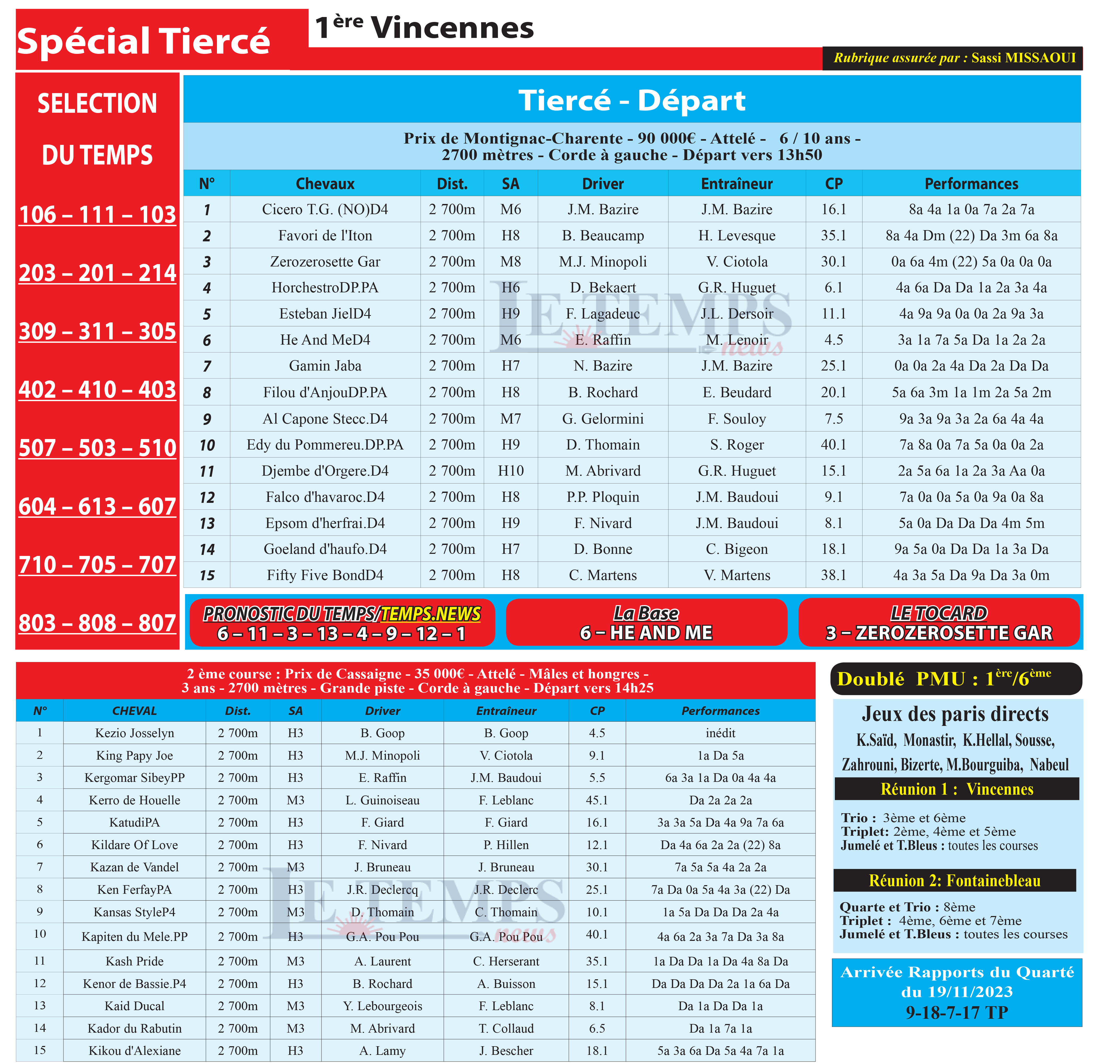 Partager Facebook Twitter LinkedIn Pinterest Email Notre spécial Tiercé d’aujourd’hui, 1ère course à Vincennes, donne notre pronostic du Temps/ Temps News avec le cheval n°6 He And Me étant la base, tandis que le Tocard est le cheval n°3 Zerozerosette Gar. PMU Turf